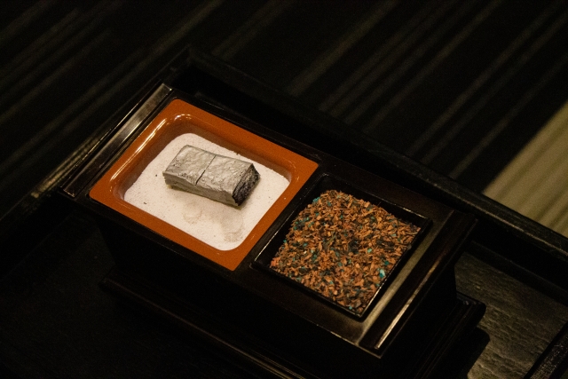 抹香を額におしいただき指をこすりながら香炉に落とす。これを3回行う。